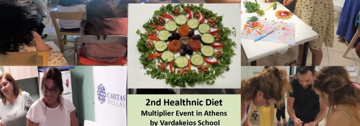 The Vardakeios School organized on the 11th September 2019 the 2nd Multiplier Event of the Healthnic Diet project in Athens at Caritas Hellas. It was an evening where professionals from different fields that work with refugees (sociologists, language teachers, workshop facilitators) had the opportunity to be informed about the intellectual outputs of the project (Practical Guide and Toolkit), the digital videos that were produced but also to ask questions related to the implementation of the Healthnic Diet workshops. On the second part of the event they had the chance to participate in a cooking session and to experiment with fruit, vegetables and spices in order to create their own Mandala based in a specific value (solidarity, acceptance, unity) and then to prepare as a group a salad with the materials they have already used.All the participants expressed their content on the knowledge gained and showed interest in organizing a Healthnic workshop. The facilitators assured them that they will be available to provide guidance if needed.